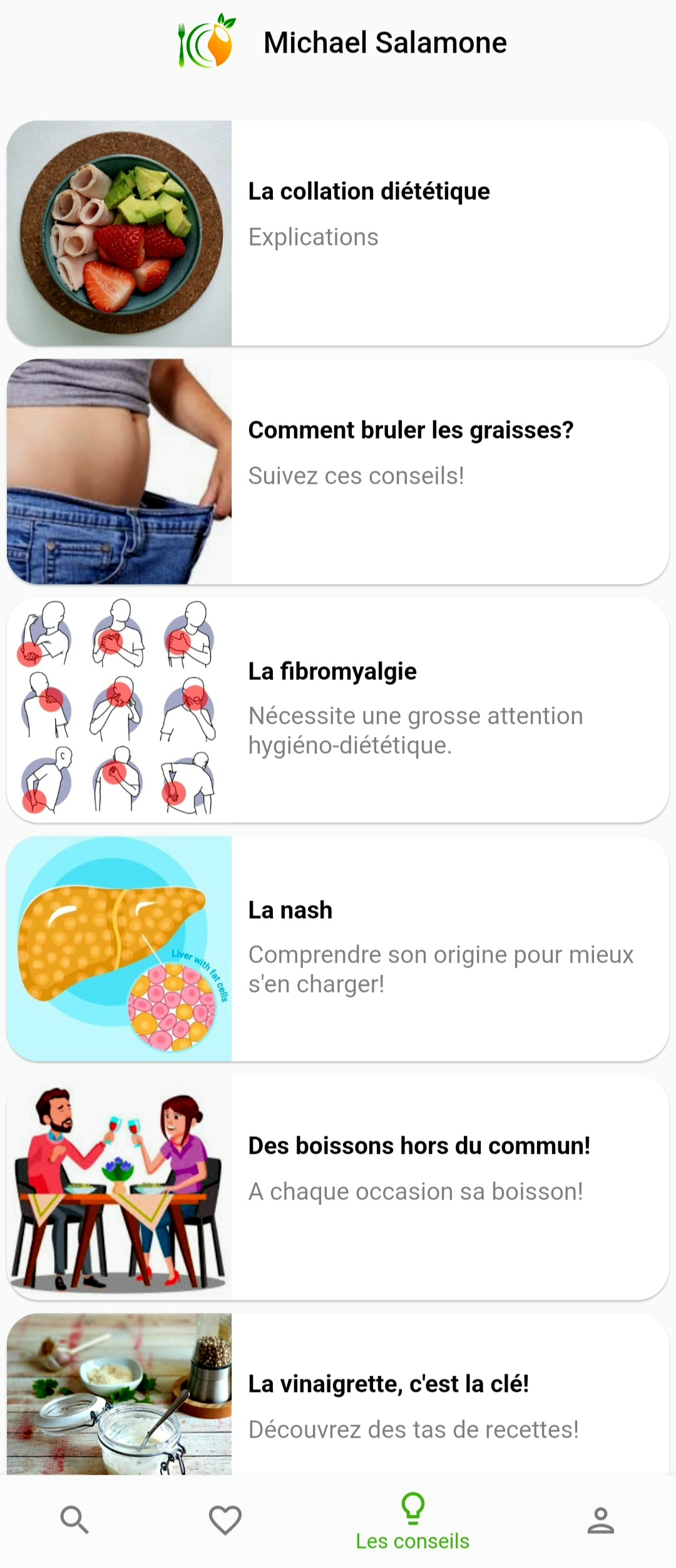 Nouveau, l'onglet "Conseils" avec des fiches conseils sur la santé, la nutrition, la cuisine, le sport...