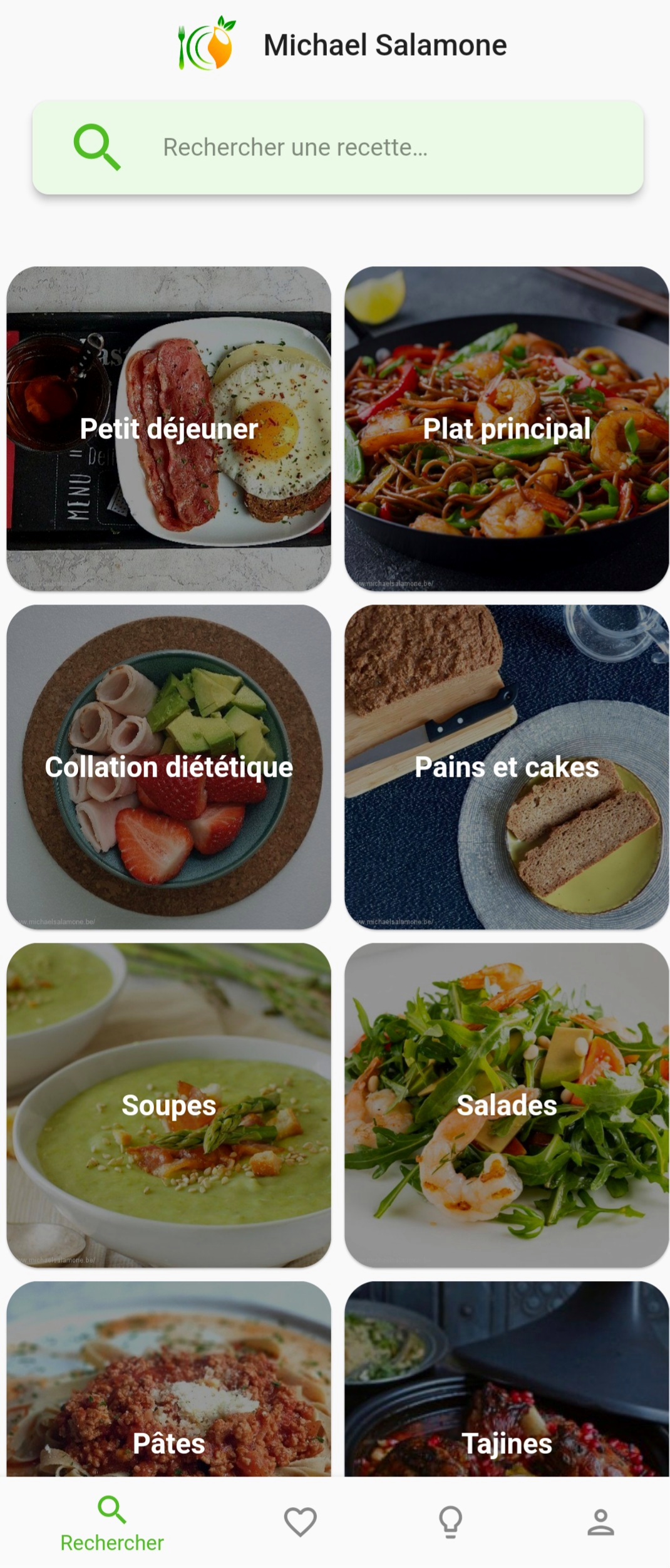 L'application "Michael Salamone" est sortie officiellement au mois de mai 2022, elle est le fruit de plus de 6 ans de travail. L'idée était de fournir un outil pratique lors des prises en charge nutritionnelle. D'une part l'utilisateur a plus de 400 recettes reparties en plusieurs catégories, ce qui lui évite de devoir chercher à gauche et à droite et d'autre part, comme il n y a que moi qui y ajoute des recettes, cela lui garantit la sécurité d'en choisir une adaptée à son plan alimentaire! Et enfin, elles sont classées selon 3 phases évolutives.